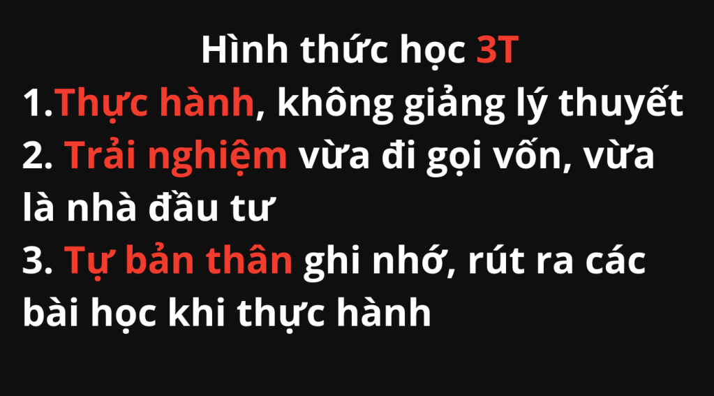 Như tiêu đề của khoá học, tất cả sẽ tập trung vào việc thực hành. Các tài liệu và bài tập sẽ được cung cấp trước cho học viên để chuẩn bị. Sau đó khi vào buổi học thì tất cả sẽ thực hành luôn, hình thức thực hành là các bạn sẽ thuyết trình trực tiếp các phần bài tập đã làm trước lớp, và nhận phản hồi của giáo viên, học viên trên lớp. Bạn sẽ cảm giác thực trong 3 buổi này là mình vừa là Startup Founders đi gọi vốn, phải thuyết trình trước hội đồng nhà đầu tư, cũng như làm nhà đầu tư tiềm năng khi nghe các dự án khác thuyết trình.