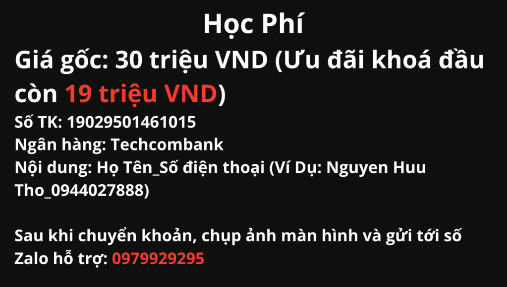 Học phí: Giá gốc 30 triệu VND (Ưu đãi khoá đầu còn 19 triệu VND)