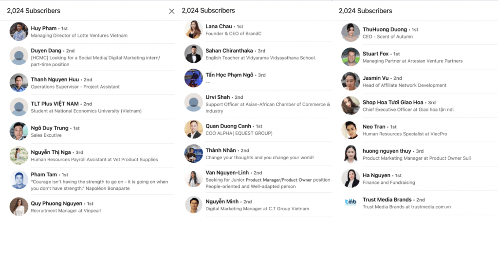 - Tiếp cận: 2k subscribers bản tin trên Linkedin, 13k followers trên Linkedin, 10k followers trên Facebook cá nhân, 11k trên Fanpage BeginGuru, 2k trên Website, Youtube, Twitter, Tiktok
