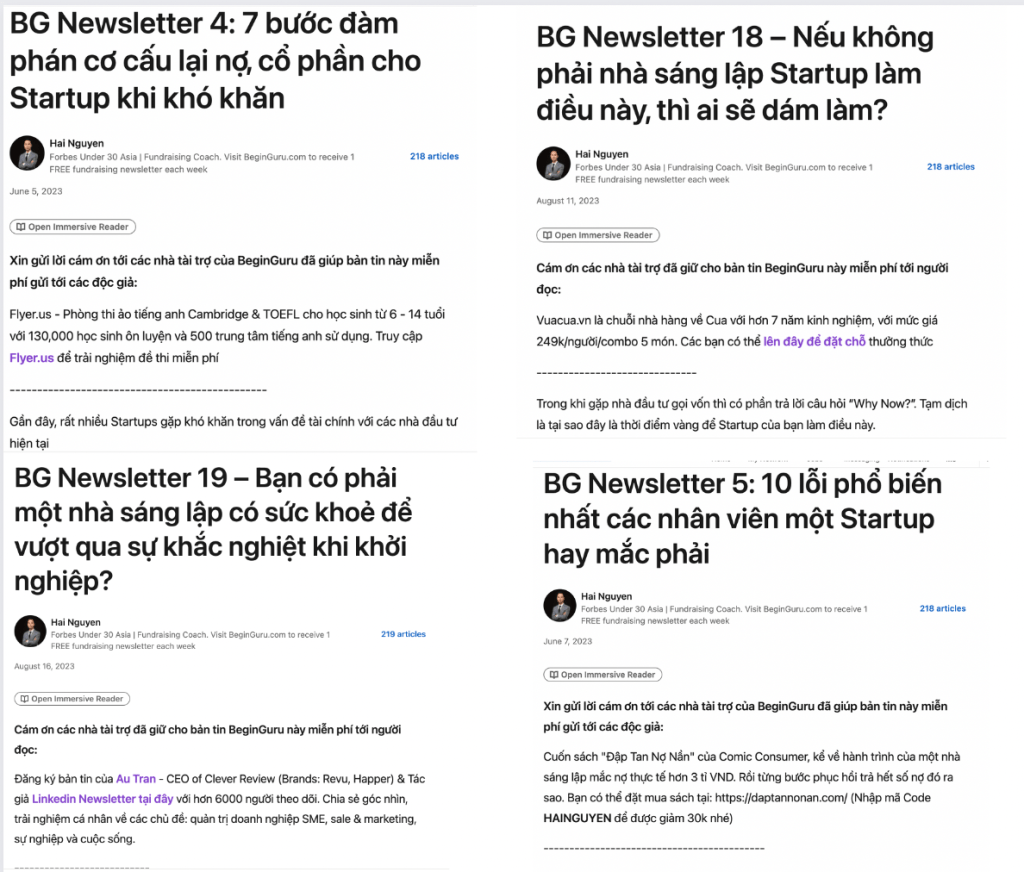 - Đổi lại, BeginGuru cũng cần đối tác cũng làm việc tương tự như vậy trên kênh bản tin của đối tác tương tự như mẫu bên trên (hoặc dưới dạng bài Post trên trang cá nhân Linkedin, Facebook như mẫu bên dưới, nếu bạn không có newsletter)