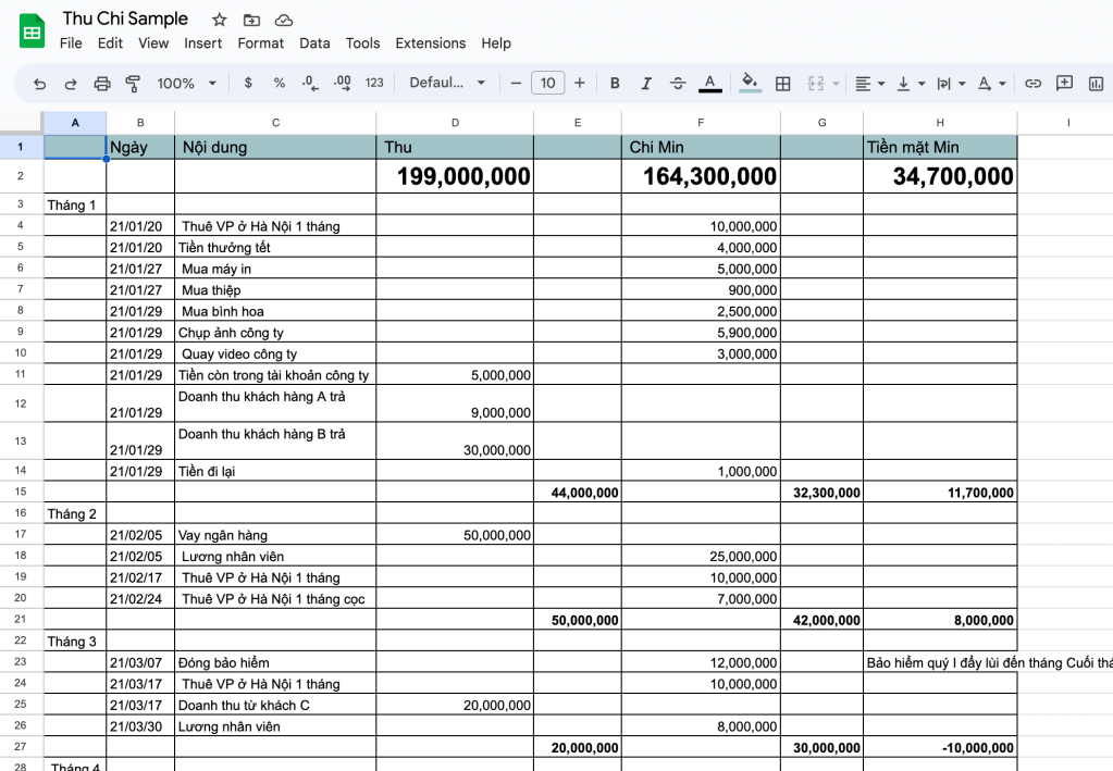 Vậy một biểu mẫu đơn giản để giúp các nhà sáng lập, doanh thu dưới 100 tỉ VND có thể làm để quản lý thu chi, và dòng tiền Startup của mình ra sao?