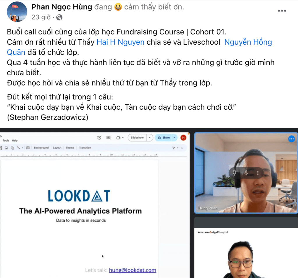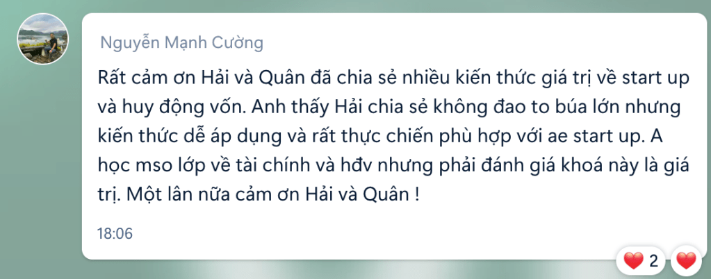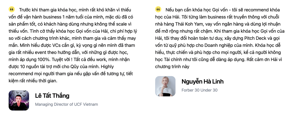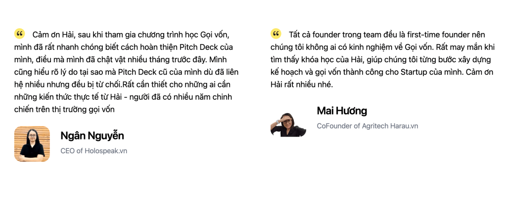 Nội dung khoá học được soạn từ kinh nghiệm thực tế trong 10 năm khởi nghiệp của tôi. Sau khi gặp gỡ, đàm phán và gọi vốn thực cho rất nhiều các công ty mà tôi tham gia như Canavi, Flyer.vn, Meta365.ai, ViVi Digital,…. Bạn sẽ thấy những gì tôi chia sẻ trong khoá học sẽ tương tự với những gì bạn làm việc với nhà đầu tư ngoài đời thực