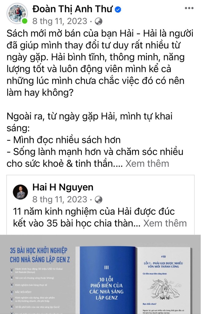 Mình hướng tới việc đạt 100 người đọc và đánh giá cuốn sách, việc này có ý nghĩa hơn nhiều so với số lượng sách bán được nhiều (hiện đang gần tới con số 1,000 cuốn) nhưng không biết là có giúp được các nhà sáng lập nào hay không